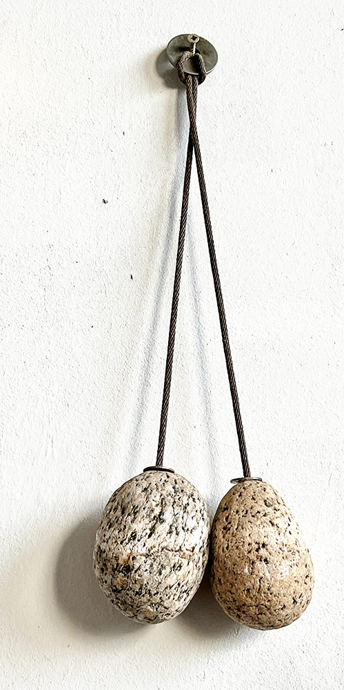 Deux boules de granit suspendues. Sorte de tac-tac minéral.