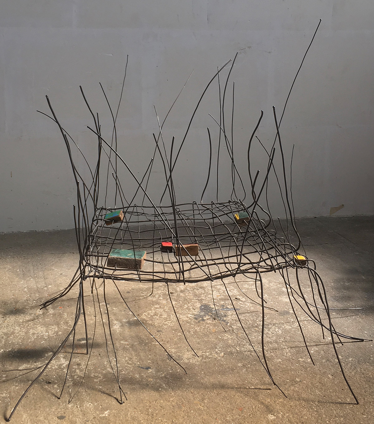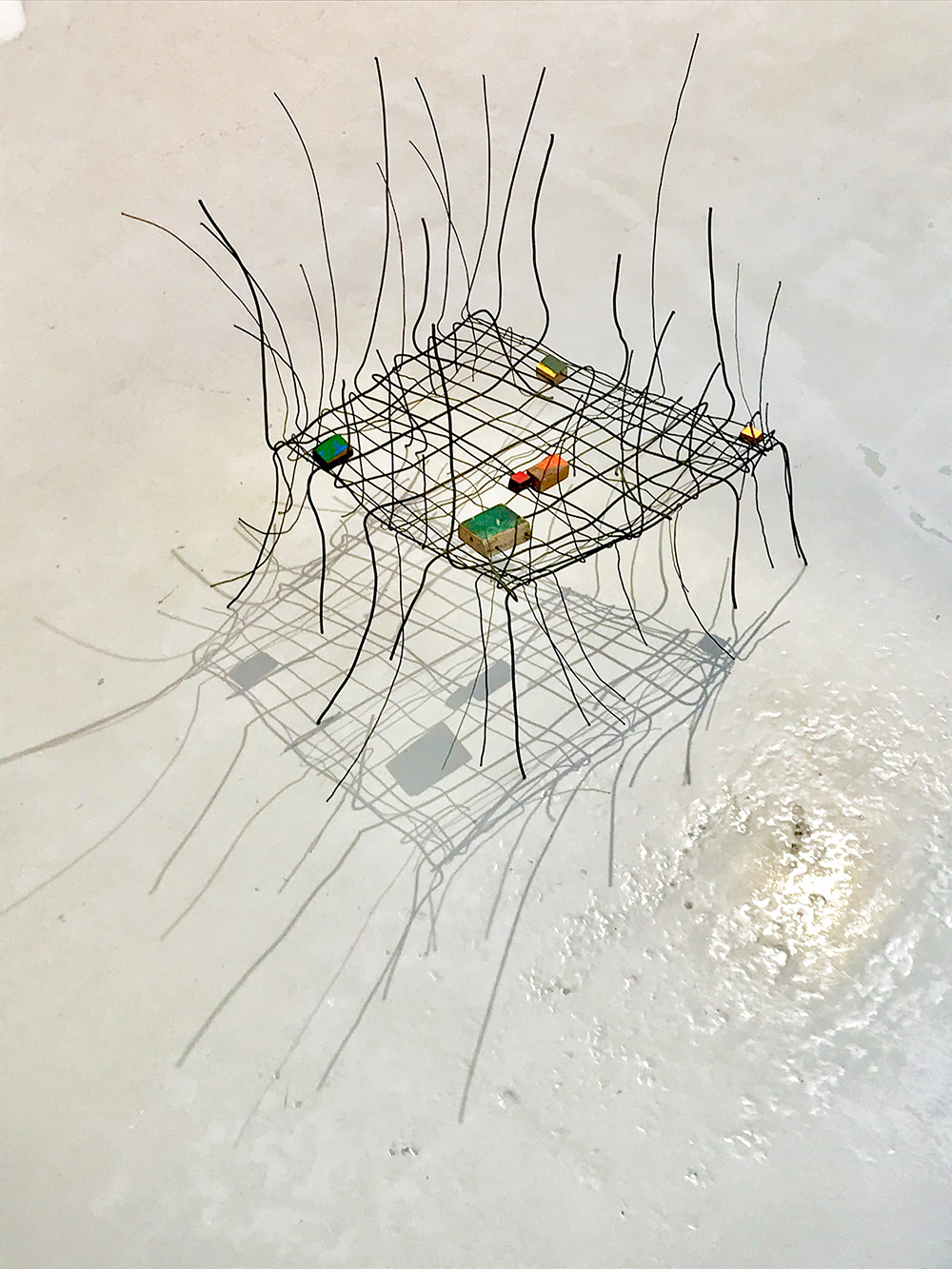 Quelques pépites captives dans un tissage métallique — un écrin à mi-chemin entre la cage et les herbes folles.