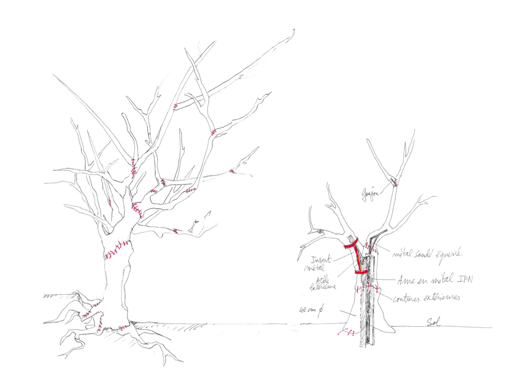 Avec les jeunes de l’île, nous recomposons un arbre : une arborescence faite de ligatures, d’attèles et de sutures en métal rouillé.