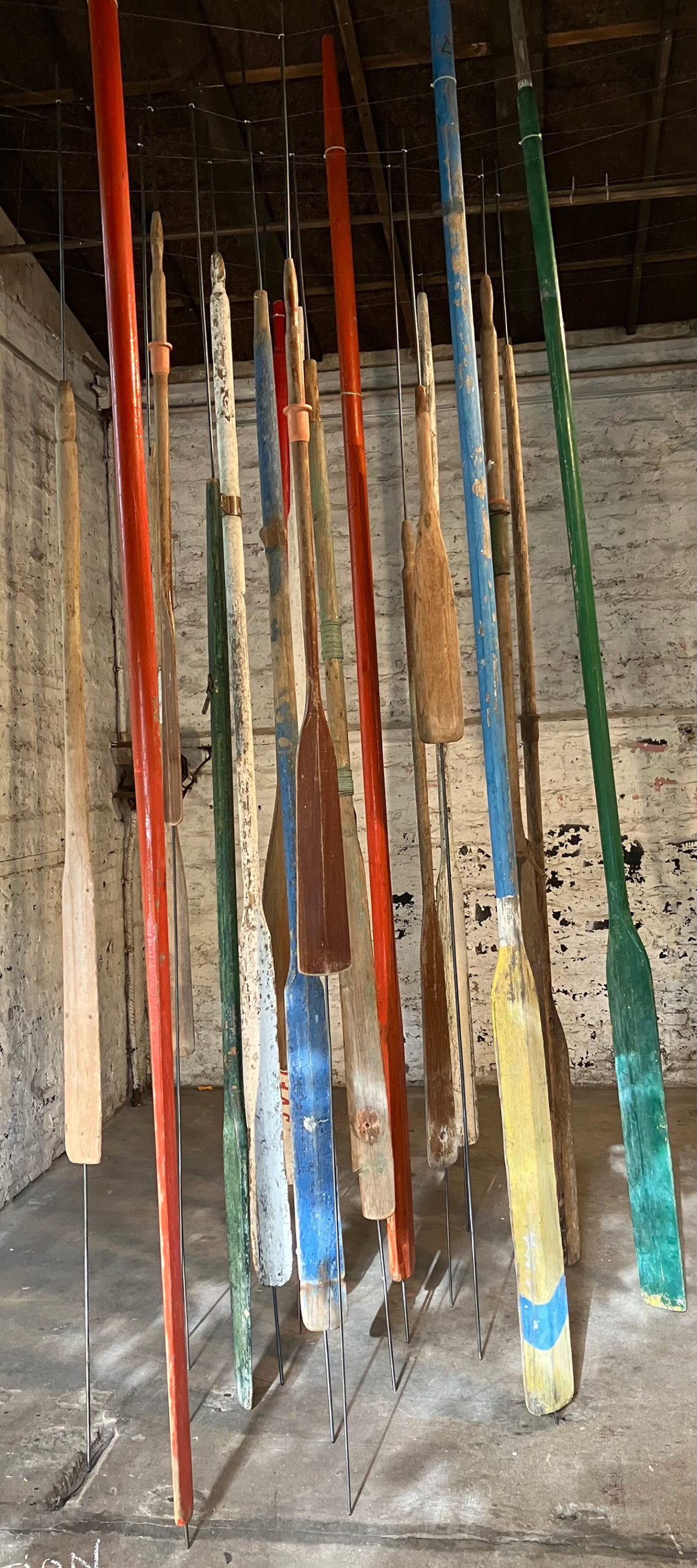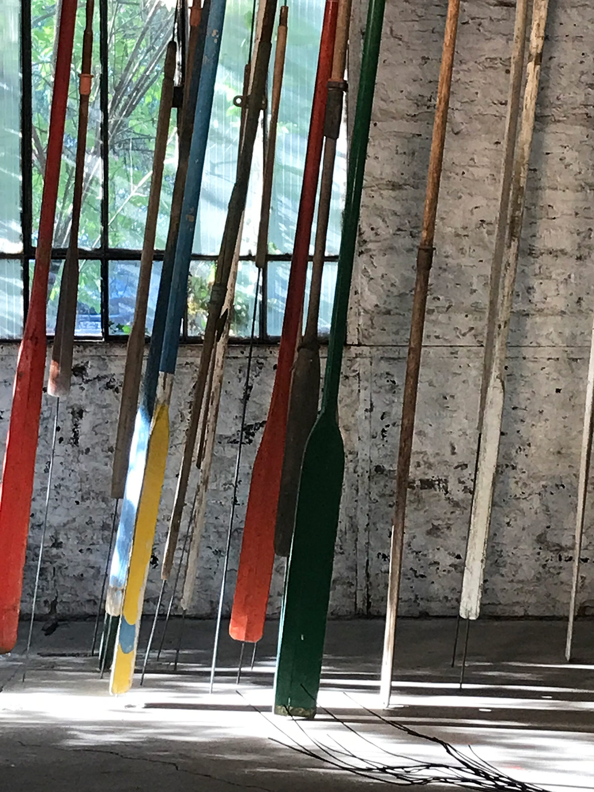 Une quinzaine de rames suspendues, alignées dans un même axe, tombent du plafond.