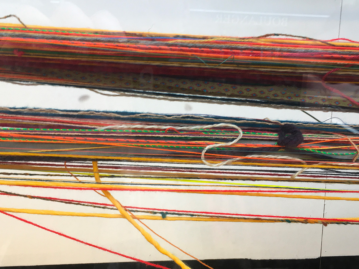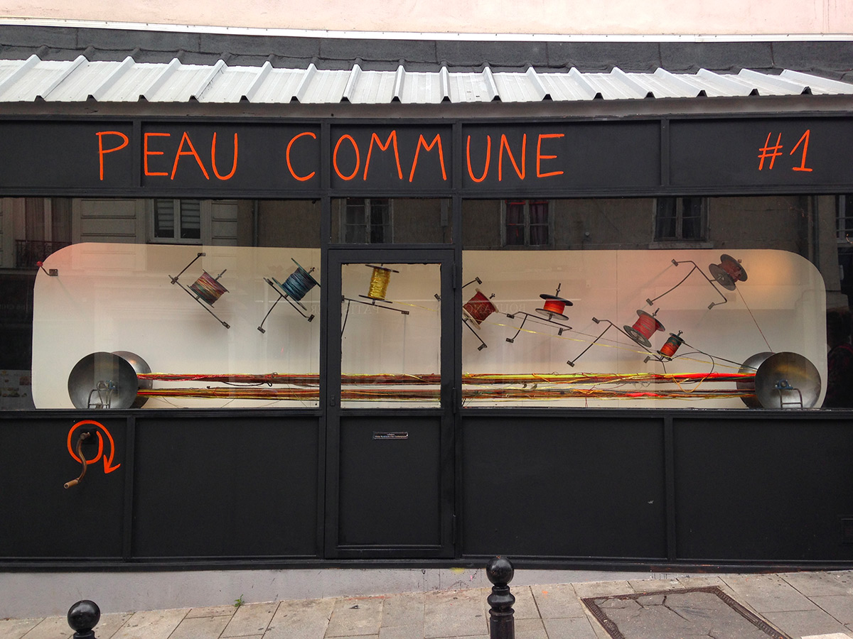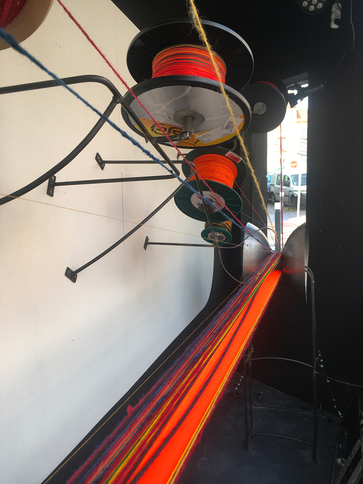 Dans la rue on est invité à actionner une solide manivelle qui sort d’une vitrine. Tout une machine se met en marche : 7 bobines suspendues au mur se dévident, déroulent fils, laines et ficelles. Tous s’enroulent sous nos yeux, d’un bout à l’autre de l’installation et forment un écheveau épais et coloré. Tour après tour, la matière se construit à plusieurs. Le dispositif ne fonctionne que par l’intervention du passant. Chaque geste ajoute sa part, chaque main renforce la continuité du flux. Quand les bobines sont vides, l’épais cordon obtenu est décroché, suspendu au mur comme un trophée commun. Les bobines sont réapprovisionnées et le processus recommence : un nouveau “mélange” naît de la pluralité.