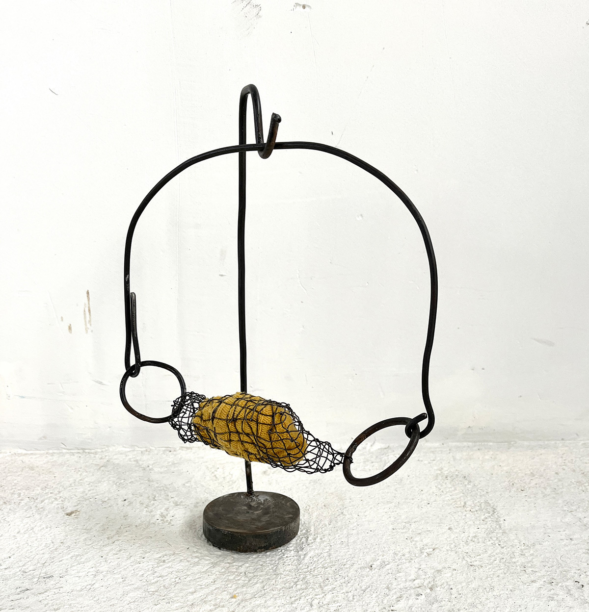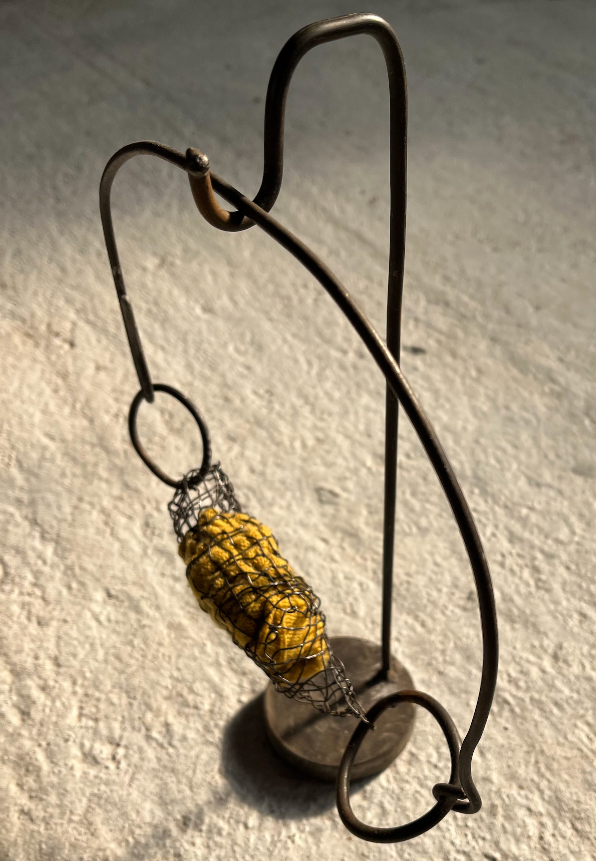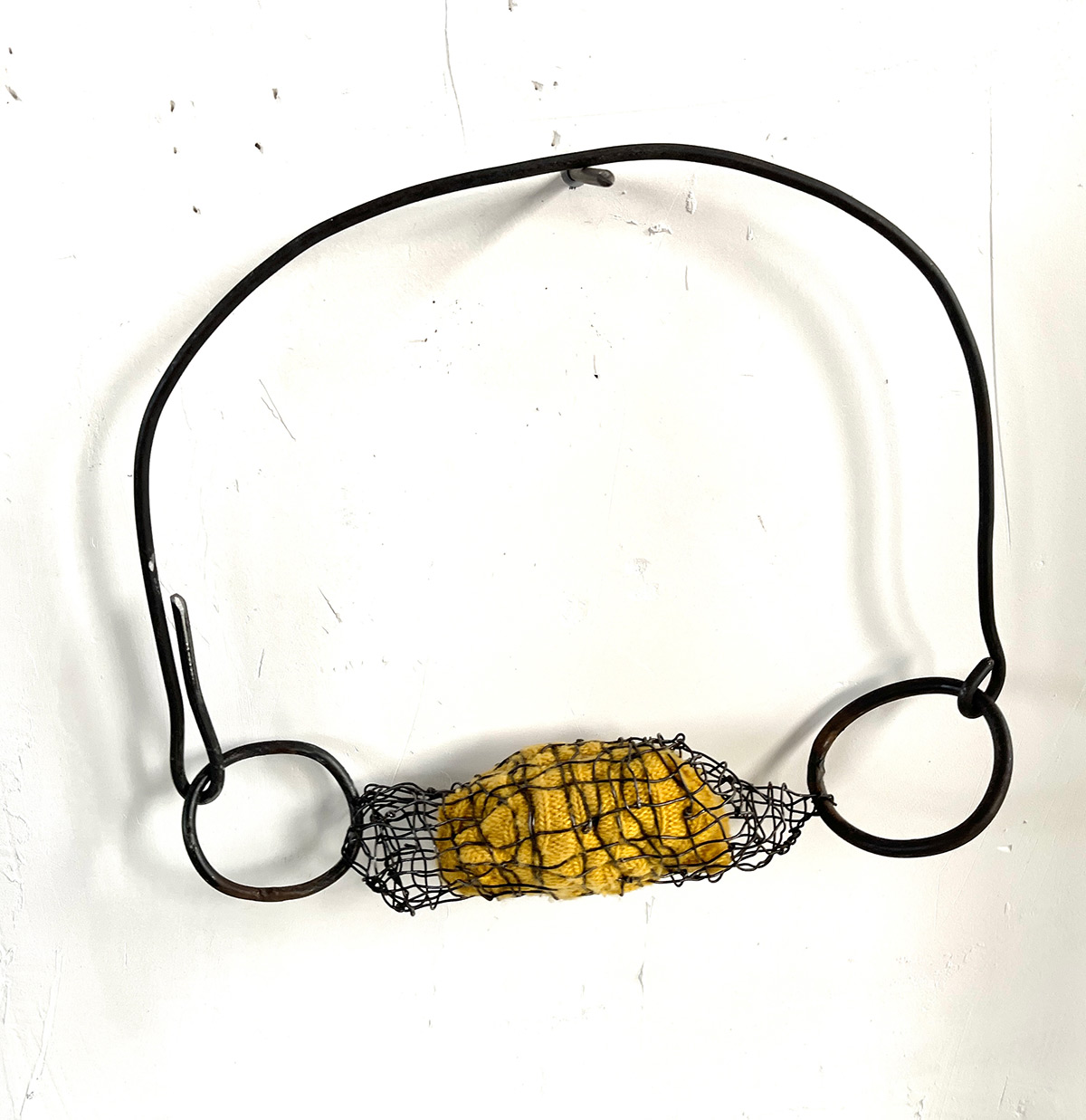 Fragments de Peau Commune, la matière jaune se referme ici dans une cage de fil. Entre bijou et instrument, le mors retient la joie avant qu’elle n’éclate.