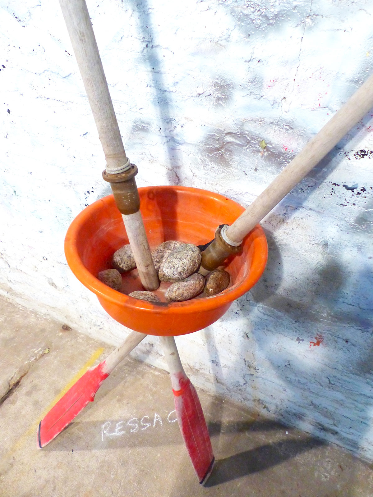 Au point d’appui, la bassine pleine de galets remue l’idée d’une bataille domestique.
