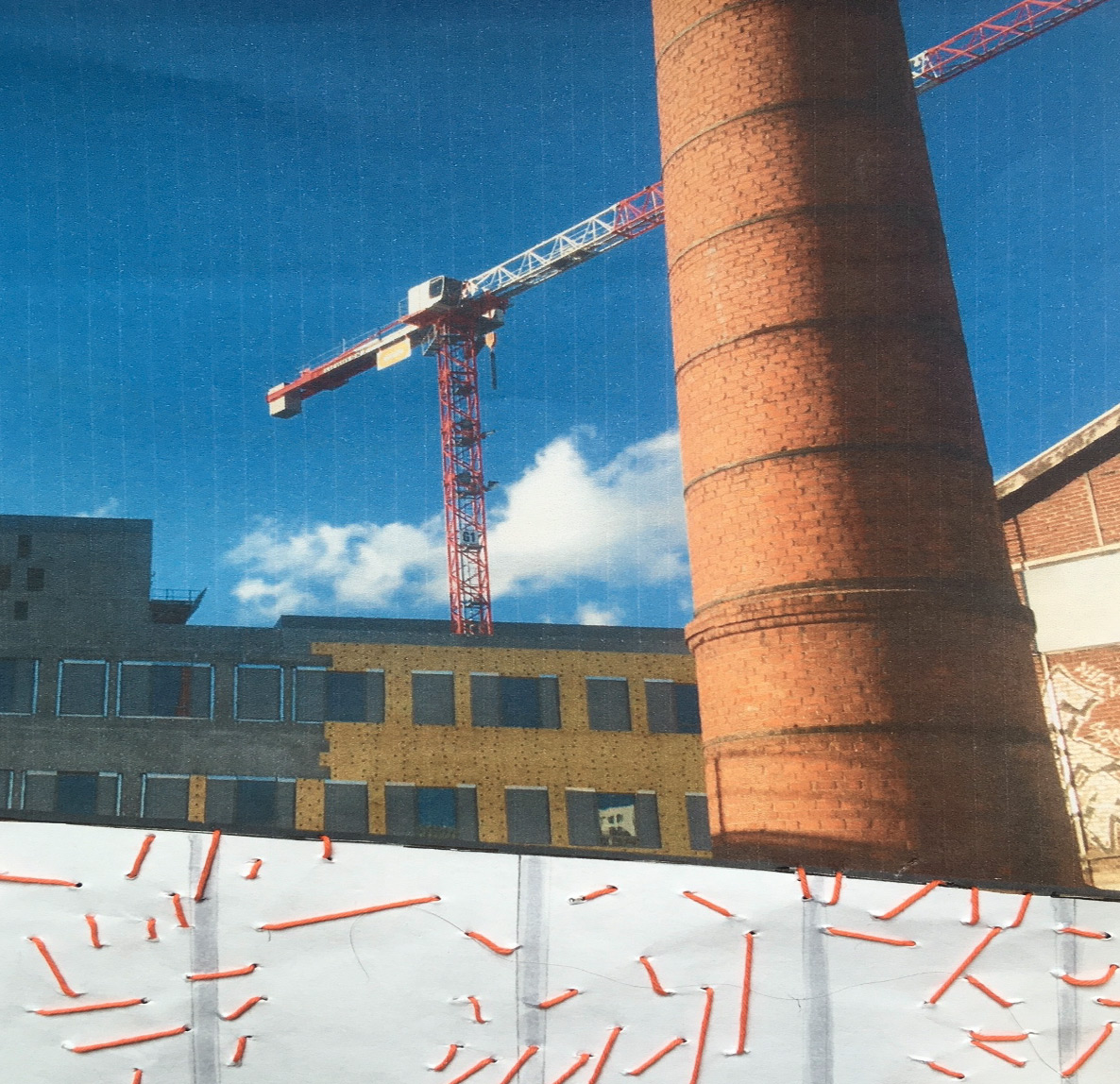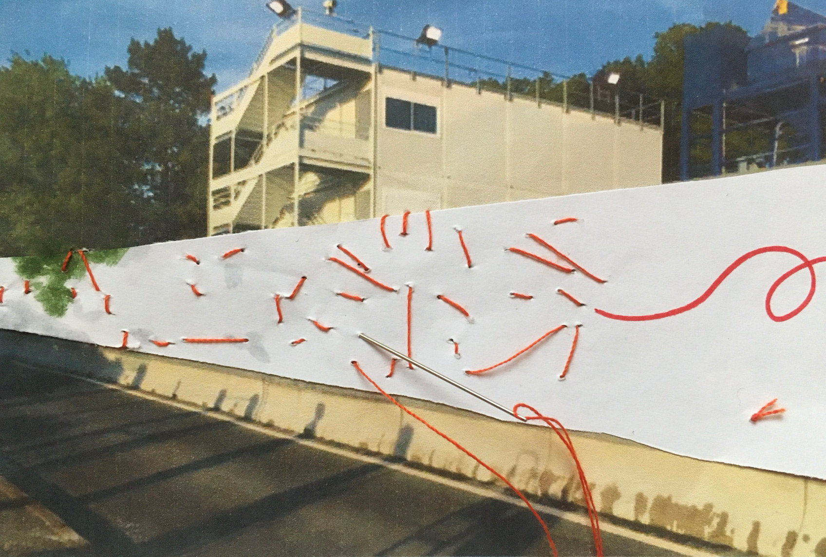 Sur la palissade d’un chantier, percée de multiples ouvertures, deux personnes se placent de chaque côté du panneau, sans se voir. Chacune passe sa drisse dans les trous, point après point, inventant un tracé que l’autre reçoit et prolonge.